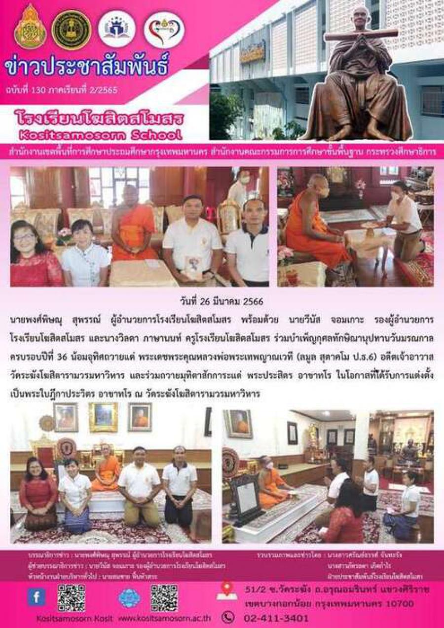 นายพงศ์พิษณุ สุพรรณ์ ผู้อำนวยการโรงเรียนโฆสิตสโมสร พร้อมด้วย นายวีนัส จอมเกาะ รองผู้อำนวยการ โรงเรียนโฆสิตสโมสร และนางวิลดา ภาษานนท์ ครูโรงเรียนโฆสิตสโมสร ร่วมบำเพ็ญกุศลทักษิณานุปทานวันมรณกาล ครบรอบปีที่ 36 น้อมอุทิศถวายแด่ พระเดชพระคุณหลวงพ่อพระเทพญาณเวที (ลมูล สุตาคโม ป.ธ.6) อดีตเจ้าอาวาสวัดระฆังโฆสิตารามวรมหาวิหาร และร่วมถวายมุทิตาสักการะแด่ พระประสิตร อาขาทโร ในโอกาสที่ไ้ด้รับการแต่งตั้งเป็นพระใบฎีกาประวิตร อาขาทโร ณ วัดระฆังโฆสิตารามวรมหาวิหาร S:0