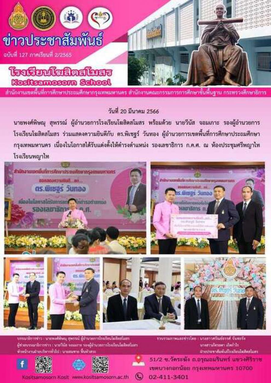 นายพงศ์พิษณุ สุพรรณ์ ผู้อำนวยการโรงเรียนโฆสิตสโมสร พร้อมด้วย นายวีนัส จอมเกาะ รองผู้อำนวยการ โรงเรียนโฆสิตสโมสร ร่วมแสดงความยินดีกับ ดร.พิเชฐร์ วันทอง ผู้อำนวยการเขตพื้นที่การศึกษาประถมศึกษากรุงเทพมหานคร เนื่องในโอกาสได้รับแต่งตั้งให้ดำรงตำแหน่ง รองเลขาธิิการ ก.ค.ศ. ณ ห้องประชุมศรีพญาไท โรงเรียนพญาไท S:0
