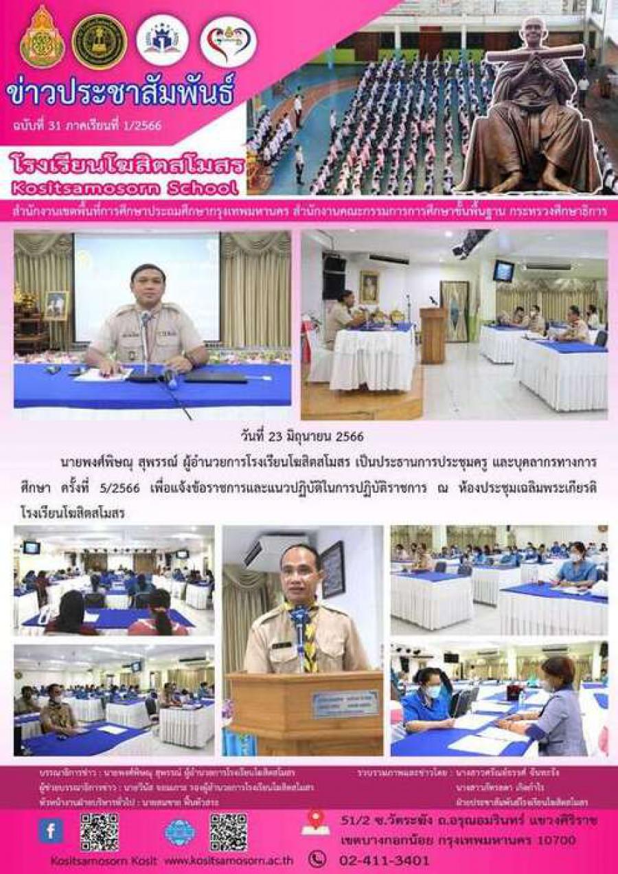 วันที่ 23 มิถุนายน 2566 นายพงศ์พิษณุ สุพรรณ์ ผู้อำนวยการโรงเรียนโฆสิตสโมสร เป็นประธานการประชุมครู และบุคลากรทางการศึกษา ครั้งที่ 5/2566 เพื่อแจ้งข้อราชการและแนวปฏิบัติในการปฏิบัติราชการ ณ ห้องประชุมเฉลิมพระเกียรติ โรงเรียนโฆสิตสโมสร S:0
