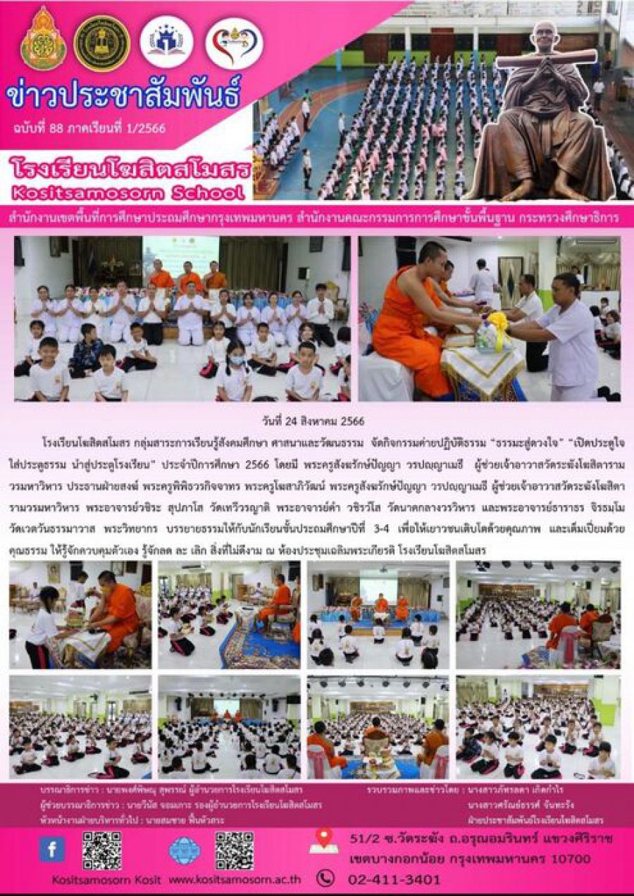 โรงเรียนโฆสิตสโมสร กลุ่มสาระการเรียนรู้สังคมศึกษา ศาสนาและวัฒนธรรม จัดกิจกรรมค่ายปฏิบัติธรรม ?ธรรมะสู่ดวงใจ? ?เปิดประตูใจ ใส่ประตูธรรม นำสู่ประตูโรงเรียน? ประจำปีการศึกษา 2566 โดยมี พระครูสังฆรักษ์ปัญญา วรปญฺญาเมธี ผู้ช่วยเจ้าอาวาสวัดระฆังโฆสิตารามวรมหาวิหาร ประธานฝ่ายสงฆ์ พระครูพิพิธวรกิจจาทร พระครูโฆสาภิวัฒน์ พระครูสังฆรักษ์ปัญญา วรปญฺญาเมธี ผู้ช่วยเจ้าอาวาสวัดระฆังโฆสิตารามวรมหาวิหาร พระอาจารย์วชิระ สุปภาโส วัดเทวีวรญาติ พระอาจารย์คำ วชิรวํโส วัดนาคกลางวรวิหาร และพระอาจารย์ธาราธร จิรธมฺโม วัดเวตวันธรรมาวาส พระวิทยากร บรรยายธรรมให้กับนักเรียนชั้นประถมศึกษาปีที่ 3-4 S:0