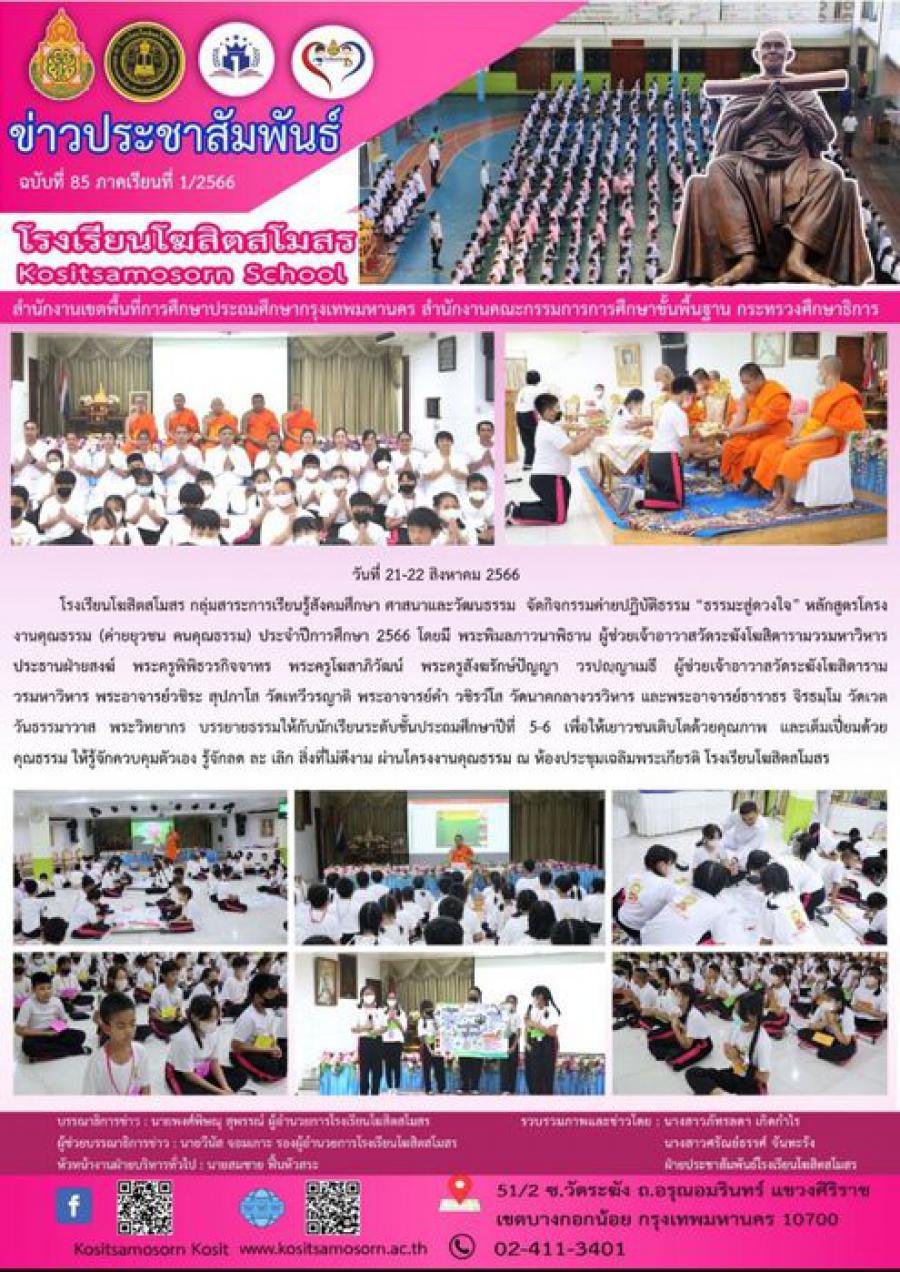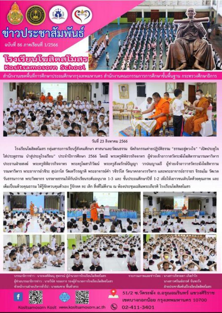 โรงเรียนโฆสิตสโมสร กลุ่มสาระการเรียนรู้สังคมศึกษา ศาสนาและวัฒนธรรม จัดกิจกรรมค่ายปฏิบัติธรรม ?ธรรมะสู่ดวงใจ? ?เปิดประตูใจ ใส่ประตูธรรม นำสู่ประตูโรงเรียน? ประจำปีการศึกษา 2566 โดยมี พระครูพิพิธวรกิจจาทร ผู้ช่วยเจ้าอาวาสวัดระฆังโฆสิตารามวรมหาวิหาร ประธานฝ่ายสงฆ์ พระครูพิพิธวรกิจจาทร พระครูโฆสาภิวัฒน์ พระครูสังฆรักษ์ปัญญา วรปญฺญาเมธี ผู้ช่วยเจ้าอาวาสวัดระฆังโฆสิตารามวรมหาวิหาร พระอาจารย์วชิระ สุปภาโส วัดเทวีวรญาติ พระอาจารย์คำ วชิรวํโส วัดนาคกลางวรวิหาร และพระอาจารย์ธาราธร จิรธมฺโม วัดเวตวันธรรมาวาส พระวิทยากร บรรยายธรรมให้กับนักเรียนระดับอนุบาล 1-3 และ ชั้นประถมศึกษาปีที่ 1-2 เพื่อให้เยาวชนเติบโตด้วยคุณภาพ และเต็มเปี่ยมด้วยคุณธรรม ให้รู้จักควบคุมตัวเอง รู้จักลด ละ เลิก สิ่งที่ไม่ดีงาม ณ ห้องประชุมเฉลิมพระเกียรติ โรงเรียนโฆสิตสโมสร S:0