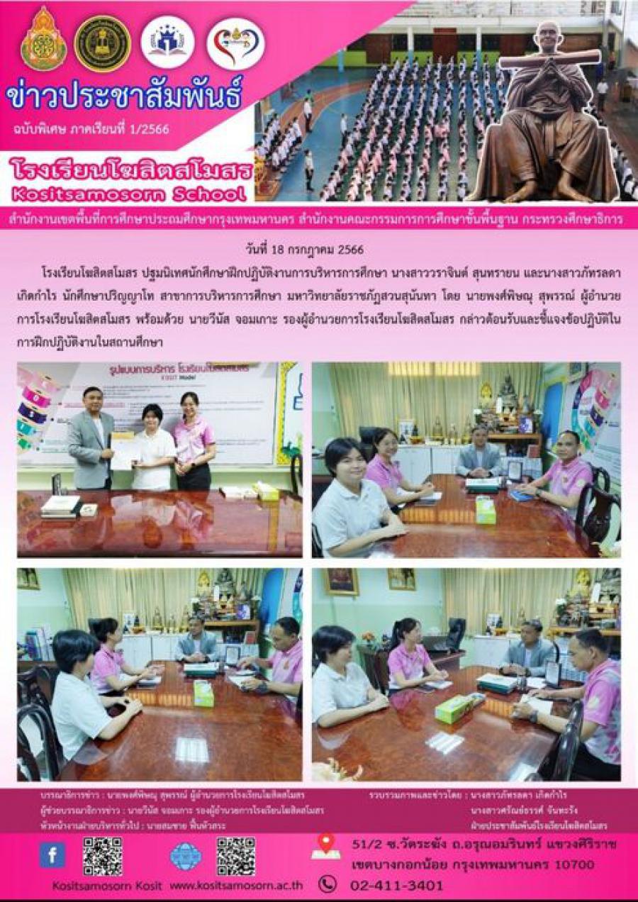 โรงเรียนโฆสิตสโมสร ปฐมนิเทศนักศึกษาฝึกปฏิบัติงานการบริหารการศึกษา นางสาววราจินต์ สุนทรายน และนางสาวภัทรลดา เกิดกำไร นักศึกษาปริญญาโท สาขาการบริหารการศึกษา มหาวิทยาลัยราชภัฏสวนสุนันทา โดย นายพงศ์พิษณุ สุพรรณ์ ผู้อำนวยการโรงเรียนโฆสิตสโมสร พร้อมด้วย นายวีนัส จอมเกาะ รองผู้อำนวยการโรงเรียนโฆสิตสโมสร กล่าวต้อนรับและชี้แจงข้อปฏิบัติในการฝึกปฏิบัติงานในสถานศึกษา S:0