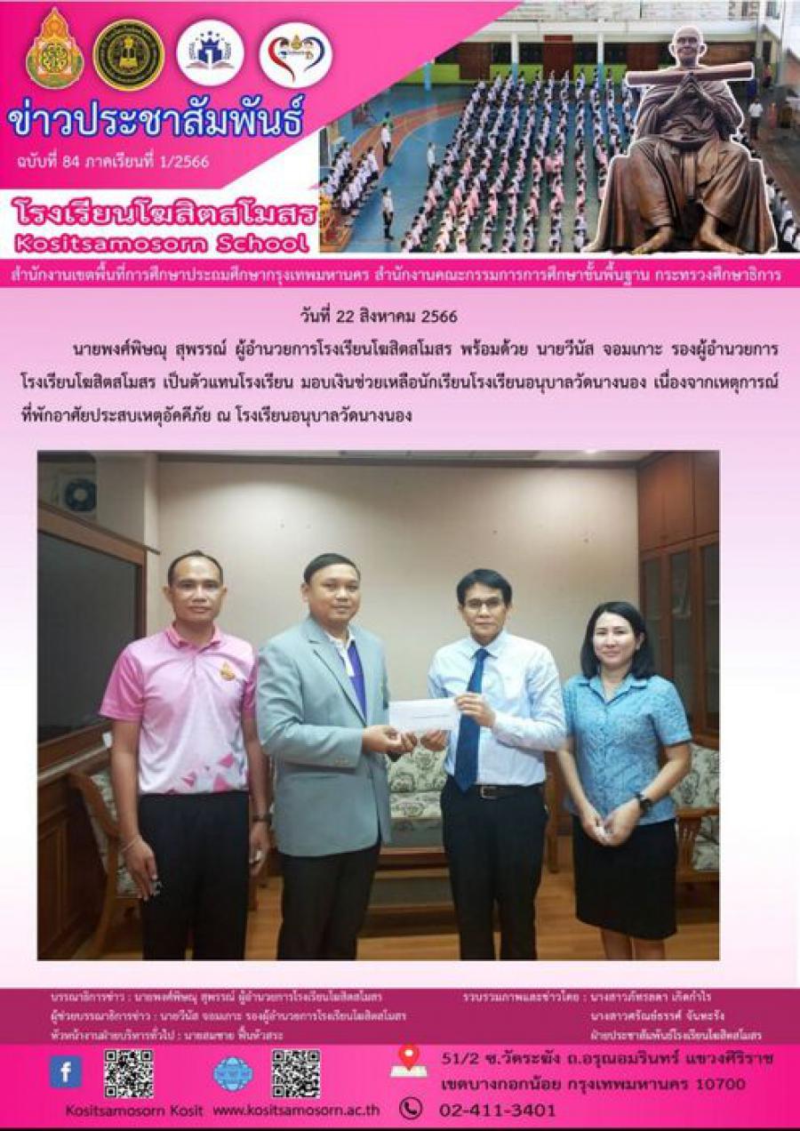 นายพงศ์พิษณุ สุพรรณ์ ผู้อำนวยการโรงเรียนโฆสิตสโมสร พร้อมด้วย นายวีนัส จอมเกาะ รองผู้อำนวยการ โรงเรียนโฆสิตสโมสร เป็นตัวแทนโรงเรียน มอบเงินช่วยเหลือนักเรียนโรงเรียนอนุบาลวัดนางนอง เนื่องจากเหตุการณ์ที่พักอาศัยประสบเหตุอัคคีภัย ณ โรงเรียนอนุบาลวัดนางนอง S:0