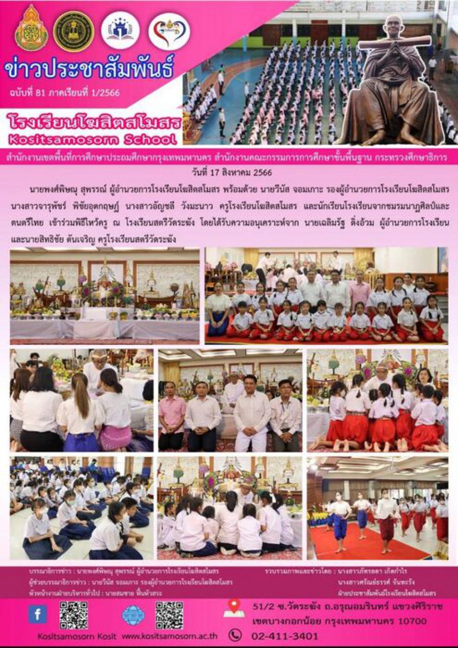 นายพงศ์พิษณุ สุพรรณ์ ผู้อำนวยการโรงเรียนโฆสิตสโมสร พร้อมด้วย นายวีนัส จอมเกาะ รองผู้อำนวยการโรงเรียนโฆสิตสโมสร นางสาวจารุพัชร์ พิชัยอุตกฤษฏ์ นางสาวอัญชลี วังมะนาว ครูโรงเรียนโฆสิตสโมสร และนักเรียนโรงเรียนจากชมรมนาฏศิลป์และดนตรีไทย เข้าร่วมพิธีไหว้ครู ณ โรงเรียนสตรีวัดระฆัง โดยได้รับความอนุเคราะห์จาก นายเฉลิมรัฐ ติ่งอ้วม ผู้อำนวยการโรงเรียน และนายสิทธิชัย ตันเจริญ ครูโรงเรียนสตรีวัดระฆัง S:0