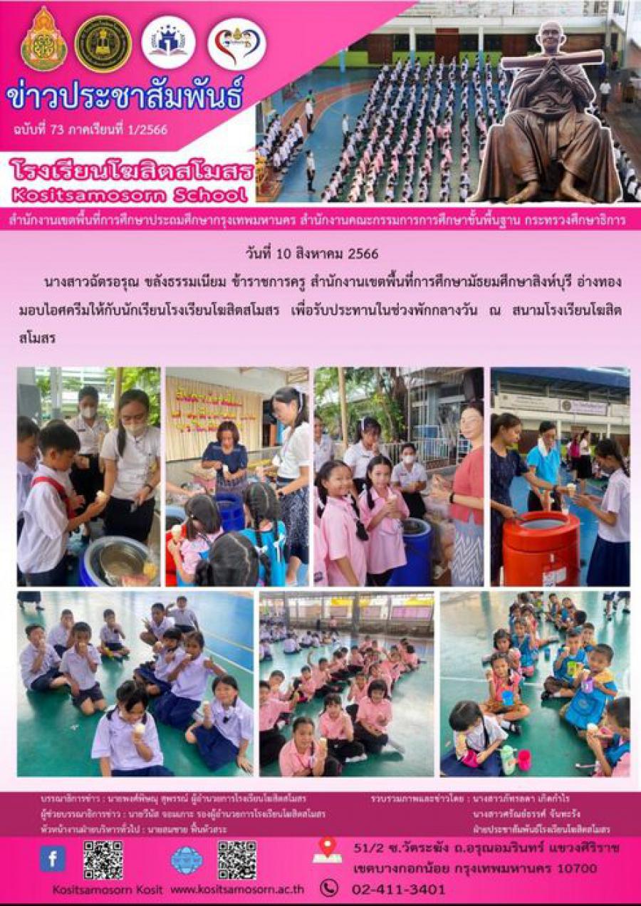 นางสาวฉัตรอรุณ ขลังธรรมเนียม ข้าราชการครู สำนักงานเขตพื้นที่การศึกษามัธยมศึกษาสิงห์บุรี อ่างทอง มอบไอศครีมให้กับนักเรียนโรงเรียนโฆสิตสโมสร เพื่อรับประทานในช่วงพักกลางวัน ณ สนามโรงเรียนโฆสิตสโมสร S:0