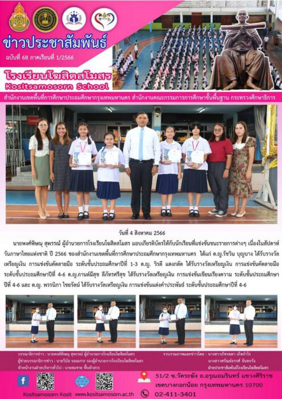 นายพงศ์พิษณุ สุพรรณ์ ผู้อำนวยการโรงเรียนโฆสิตสโมสร มอบเกียรติบัตรให้กับนักเรียนที่แข่งขันชนะรายการต่างๆ เนื่องในสัปดาห์วันภาษาไทยแห่งชาติ ปี 2566 ของสำนักงานเขตพื้นที่การศึกษาประถมศึกษากรุงเทพมหานคร ได้แก่ ด.ญ.รัชวิน บุญบาง ได้รับรางวัลเหรียญเงิน การแข่งขันคัดลายมือ ระดับชั้นประถมศึกษาปีที่ 1-3 ด.ญ. วิรตี แดงกลัด ได้รับรางวัลเหรียญเงิน การแข่งขันคัดลายมือ ระดับชั้นประถมศึกษาปีที่ 4-6 ด.ญ.กานต์มีสุข ลีภัทรศรีสุข ได้รับรางวัลเหรียญเงิน การแข่งขันเขียนเรียงความ ระดับชั้นประถมศึกษาปีที่ 4-6 และ ด.ญ. พรรนิภา ไชยรัตน์ ได้รับรางวัลเหรียญเงิน การแข่งขันแต่งคำประพันธ์ ระดับชั้นประถมศึกษาปีที่ 4-6 S:0