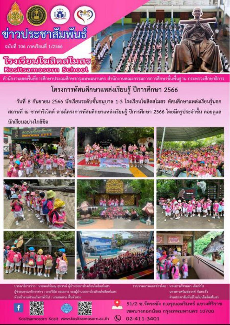 วันที่ 8 กันยายน 2566 นักเรียนระดับชั้นอนุบาล 1-3 โรงเรียนโฆสิตสโมสร ทัศนศึกษาแหล่งเรียนรู้นอกสถานที่ ณ ซาฟารีเวิลด์ ตามโครงการทัศนศึกษาแหล่งเรียนรู้ ปีการศึกษา 2566 โดยมีครูประจำชั้น คอยดูแลนักเรียนอย่างใกล้ชิด S:0