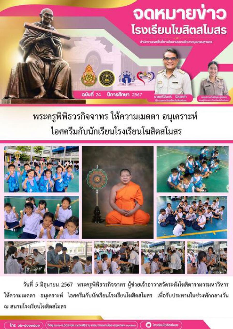 พระครูพิพิธวรกิจจาทร ให้ความเมตตา อนุเคราะห์ ไอศครีมกับนักเรียนโรงเรียนโฆสิตสโมสร วันที่ 5 มิถุนายน 2567 พระครูพิพิธวรกิจจาทร ผู้ช่วยเจ้าอาวาสวัดระฆังโฆสิตารามวรมหาวิหาร ให้ความเมตตา อนุเคราะห์ ไอศครีมกับนักเรียนโรงเรียนโฆสิตสโมสร เพื่อรับประทานในช่วงพักกลางวัน ณ สนามโรงเรียนโฆสิตสโมสร S:0