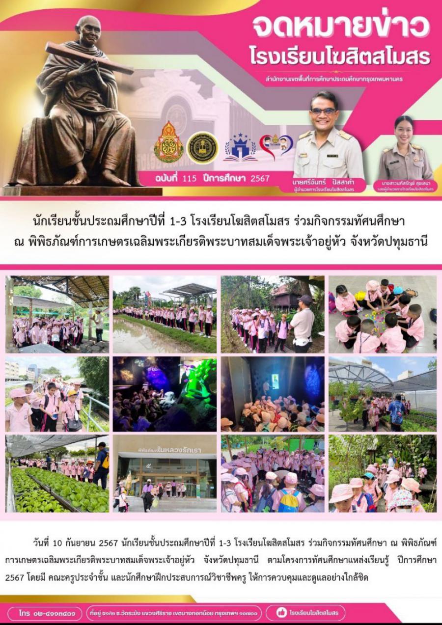 นักเรียนชั้นประถมศึกษาปีที่ 1-3 โรงเรียนโฆสิตสโมสร ร่วมกิจกรรมทัศนศึกษา ณ พิพิธภัณฑ์การเกษตรเฉลิมพระเกียรติพระบาทสมเด็จพระเจ้าอยู่หัว จังหวัดปทุมธานี S:0