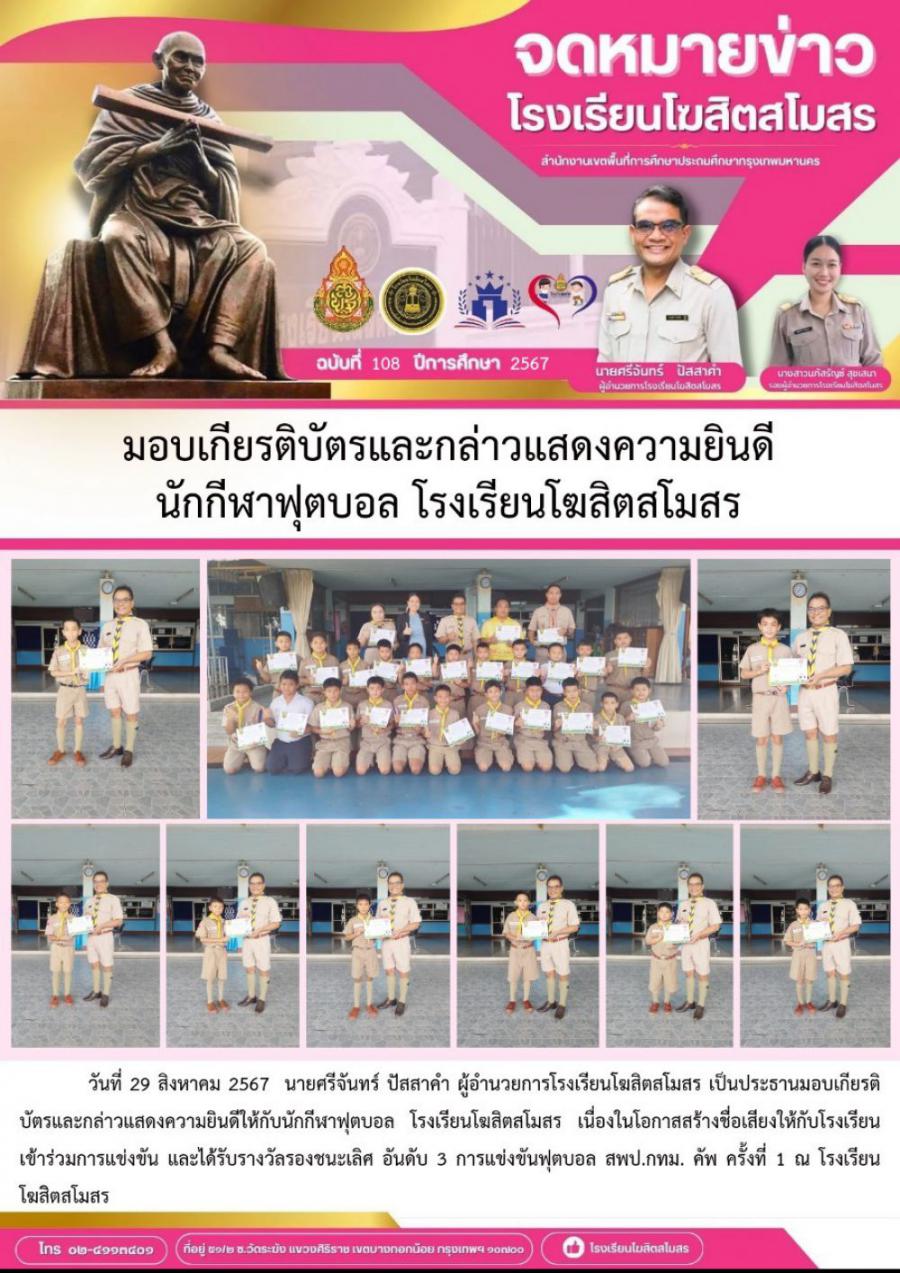 มอบเกียรติบัตรและกล่าวแสดงความยินดี นักกีฬาฟุตบอล โรงเรียนโฆสิตสโมสร