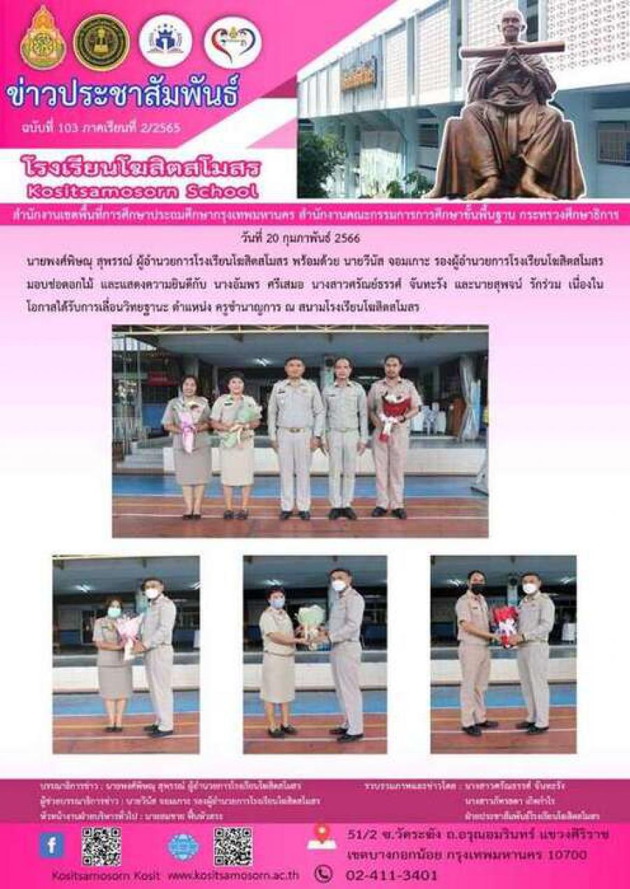 ผู้อำนวยการมอบช่อดอกไม้แสดงความยินดีกับคณะครูที่ได้เลื่อนวิทยฐานะชำนาญการ