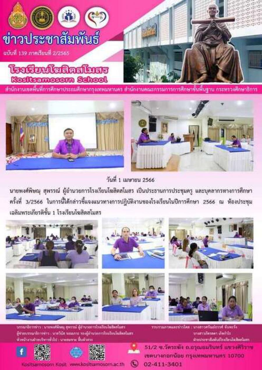 นายพงศ์พิษณุ สุพรรณ์ ผู้อำนวยการโรงเรียนโฆสิตสโมสร เป็นประธานการประชุมครู และบุคลากรทางการศึกษา ครั้งที่ 3/2566 ในการนี้ได้กล่าวชี้แจงแนวทางการปฎิบัติงานของโรงเรียนในปีการศึกษา 2566 ณ ห้องประชุมเฉลิมพระเกียรติชั้น 1 โรงเรียนโฆสิตสโมสร S:0