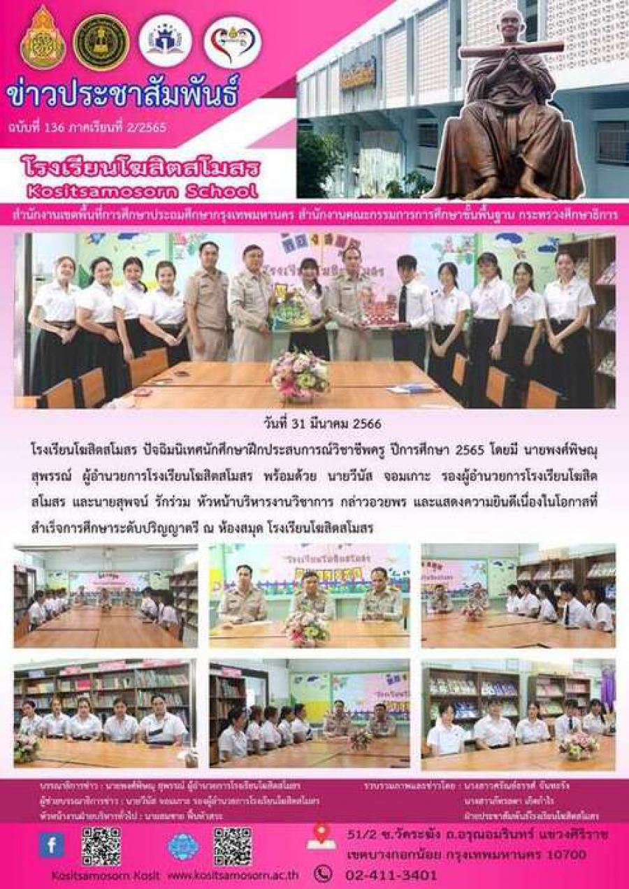 โรงเรียนโฆสิตสโมสร ปัจฉิมนิเทศนักศึกษาฝึกประสบการณ์วิชาชีพครู ปีการศึกษา 2565 โดยมี นายพงศ์พิษณุ สุพรรณ์ ผู้อำนวยการโรงเรียนโฆสิตสโมสร พร้อมด้วย นายวีนัส จอมเกาะ รองผู้อำนวยการโรงเรียนโฆสิตสโมสร และนายสุพจน์ รักร่วม หัวหน้าบริหารงานวิชาการ กล่าวอวยพร และแสดงความยินดีเนื่องในโอกาสที่สำเร็จการศึกษาระดับปริญญาตรี ณ ห้องสมุด โรงเรียนโฆสิตสโมสร S:0