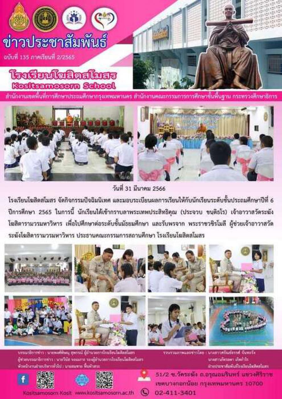 โรงเรียนโฆสิตสโมสร จัดกิจกรรมปัจฉิมนิเทศ และมอบระเบียนผลการเรียนให้กับนักเรียนระดับชั้นประถมศึกษาปีที่ 6 ปีการศึกษา 2565 ในการนี้ นักเรียนได้เข้ากราบลาพระเทพประสิทธิคุณ (ประจวบ ขนฺติธโร) เจ้าอาวาสวัดระฆัง โฆสิตารามวรมหาวิหาร เพื่อไปศึกษาต่อระดับชั้นมัธยมศึกษา และรับพรจาก พระราชวชิรโมลี ผู้ช่วยเจ้าอาวาสวัดระฆังโฆสิตารามวรมหาวิหาร ประธานคณะกรรมการสถานศึกษา โรงเรียนโฆสิตสโมสร S:0