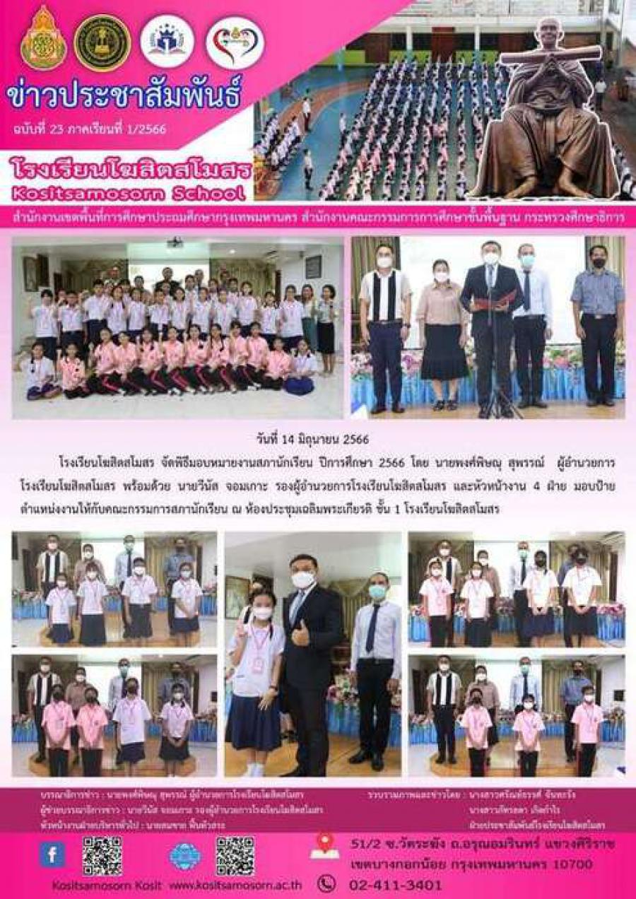 วันที่ 14 มิถุนายน 2566 โรงเรียนโฆสิตสโมสร จัดพิธีมอบหมายงานสภานักเรียน ปีการศึกษา 2566 โดย นายพงศ์พิษณุ สุพรรณ์ ผู้อำนวยการโรงเรียนโฆสิตสโมสร พร้อมด้วย นายวีนัส จอมเกาะ รองผู้อำนวยการโรงเรียนโฆสิตสโมสร และหัวหน้างาน 4 ฝ่าย มอบป้ายตำแหน่งงานให้กับคณะกรรมการสภานักเรียน ณ ห้องประชุมเฉลิมพระเกียรติ ชั้น 1 โรงเรียนโฆสิตสโมสร S:0