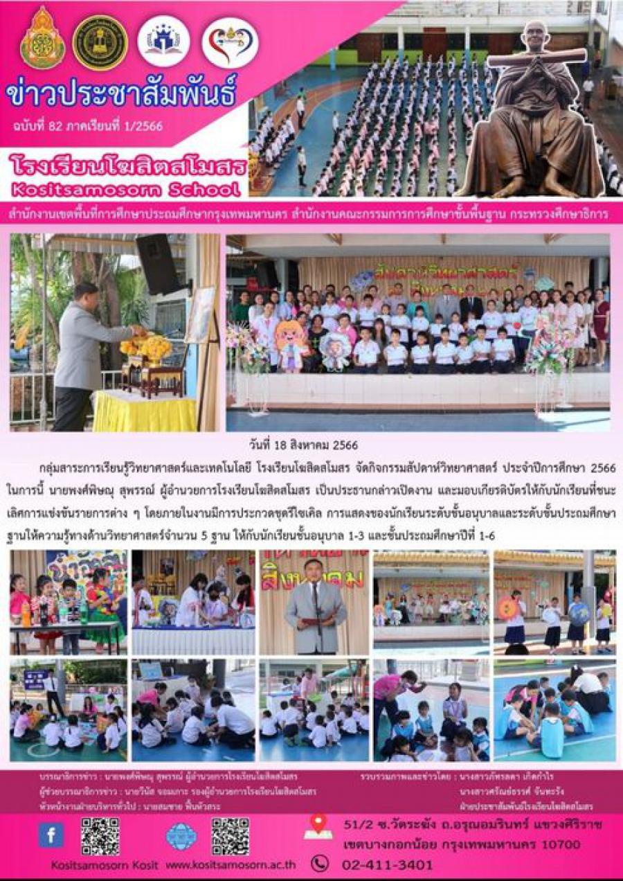 กลุ่มสาระการเรียนรู้วิทยาศาสตร์และเทคโนโลยี โรงเรียนโฆสิตสโมสร จัดกิจกรรมสัปดาห์วิทยาศาสตร์ ประจำปีการศึกษา 2566 ในการนี้ นายพงศ์พิษณุ สุพรรณ์ ผู้อำนวยการโรงเรียนโฆสิตสโมสร เป็นประธานกล่าวเปิดงาน และมอบเกียรติบัตรให้กับนักเรียนที่ชนะเลิศการแข่งขันรายการต่าง ๆ โดยภายในงานมีการประกวดชุดรีไซเคิล การแสดงของนักเรียนระดับชั้นอนุบาลและระดับชั้นประถมศึกษา ฐานให้ความรู้ทางด้านวิทยาศาสตร์จำนวน 5 ฐาน ให้กับนักเรียนชั้นอนุบาล 1-3 และชั้นประถมศึกษาปีที่ 1-6 S:0