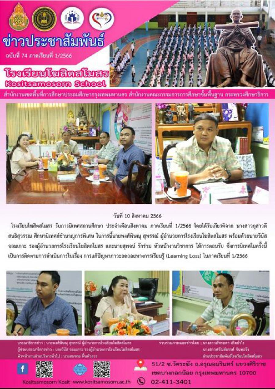 โรงเรียนโฆสิตสโมสร รับการนิเทศสถานศึกษา ประจำเดือนสิงหาคม ภาคเรียนที่ 1/2566 โดยได้รับเกียรติจาก นางสาวกุสาวดี สนธิสุวรรณ ศึกษานิเทศก์ชำนาญการพิเศษ ในการนี้นายพงศ์พิษณุ สุพรรณ์ ผู้อำนวยการโรงเรียนโฆสิตสโมสร พร้อมด้วยนายวีนัส จอมเกาะ รองผู้อำนวยการโรงเรียนโฆสิตสโมสร และนายสุพจน์ รักร่วม หัวหน้างานวิชาการ ให้การตอนรับ ซึ่งการนิเทศในครั้งนี้เป็นการติดตามการดำเนินการในเรื่อง การแก้ปัญหาภาวะถดถอยทางการเรียนรู้ (Learning Loss) ในภาคเรียนที่ 1/2566 S:0