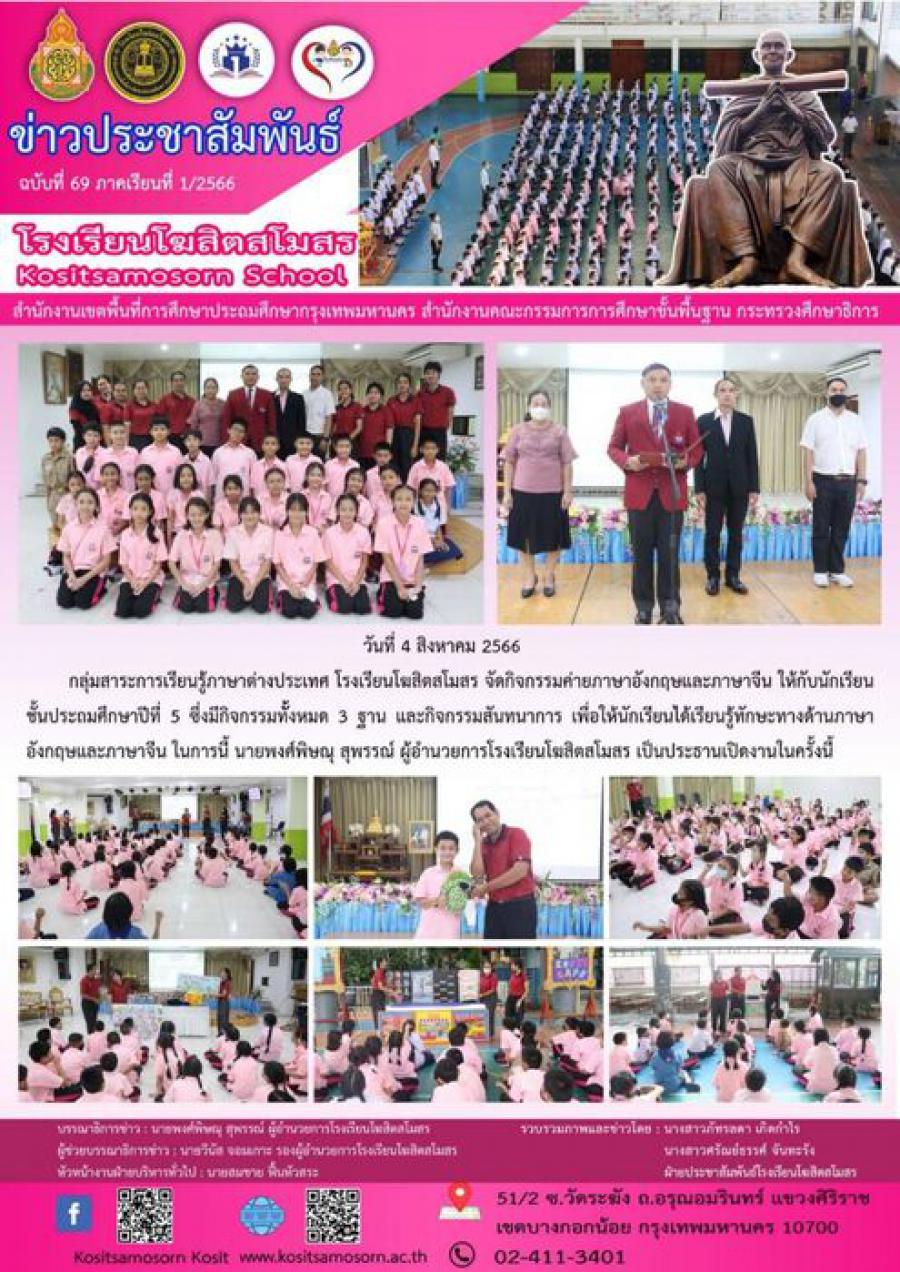 กลุ่มสาระการเรียนรู้ภาษาต่างประเทศ โรงเรียนโฆสิตสโมสร จัดกิจกรรมค่ายภาษาอังกฤษและภาษาจีน ให้กับนักเรียนชั้นประถมศึกษาปีที่ 5 ซึ่งมีกิจกรรมทั้ั้งหมด 3 ฐาน และกิจกรรมสันทนาการ เพื่อให้นักเรียนได้เรียนรู้ทักษะทางด้านภาษาอังกฤษและภาษาจีน ในการนี้ นายพงศ์พิษณุ สุพรรณ์ ผู้อำนวยการโรงเรียนโฆสิตสโมสร เป็นประธานเปิดงานในครั้งนี้ S:0