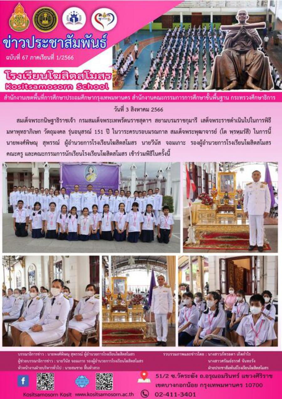 สมเด็จพระกนิษฐาธิราชเจ้า กรมสมเด็จพระเทพรัตนราชสุดาฯ สยามบรมราชกุมารี เสด็จพระราชดำเนินไปในการพิธีมหาพุทธาภิเษก วัตถุมงคล รุ่นอนุสรณ์ 151 ปี ในวาระครบรอบมรณกาล สมเด็จพระพุฒาจารย์ (โต พฺรหฺมรํสี) ในการนี้ นายพงศ์พิษณุ สุพรรณ์ ผู้อำนวยการโรงเรียนโฆสิตสโมสร นายวีนัส จอมเกาะ รองผู้อำนวยการโรงเรียนโฆสิตสโมสร คณะครู และคณะกรรมการนักเรียนโรงเรียนโฆสิตสโมสร เข้าร่วมพิิธีในครั้งนี้ S:0