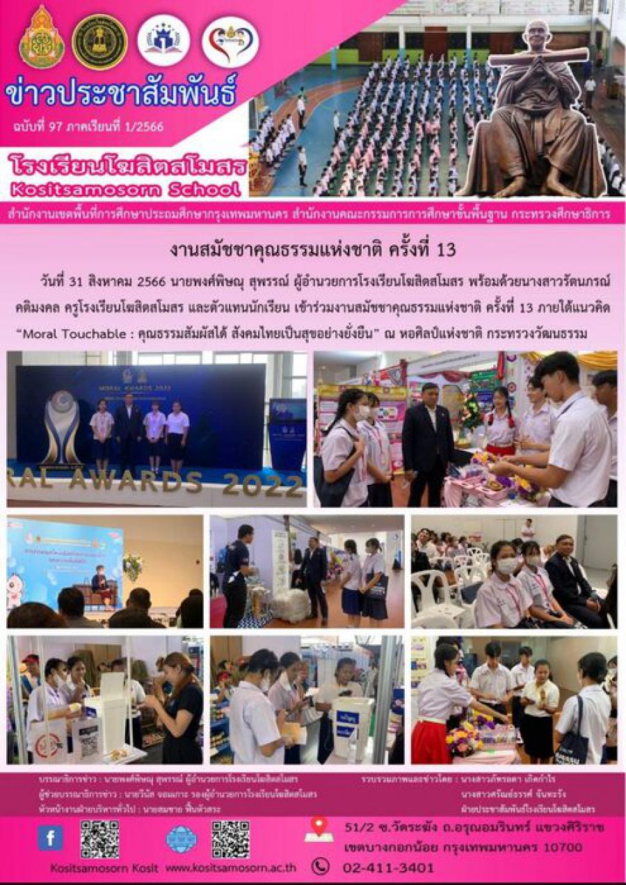 งานสมัชชาคุณธรรมแห่งชาติ ครั้งที่ 13 วันที่ 31 สิงหาคม 2566 นายพงศ์พิษณุ สุพรรณ์ ผู้อำนวยการโรงเรียนโฆสิตสโมสร พร้อมด้วยนางสาวรัตนภรณ์ คติมงคล ครูโรงเรียนโฆสิตสโมสร และตัวแทนนักเรียน เข้าร่วมงานสมัชชาคุณธรรมแห่งชาติ ครั้งที่ 13 ภายใต้แนวคิด ?Moral Touchable : คุณธรรมสัมผัสได้ สังคมไทยเป็นสุขอย่างยั่งยืน? ณ หอศิลป์แห่งชาติ กระทรวงวัฒนธรรม S:0
