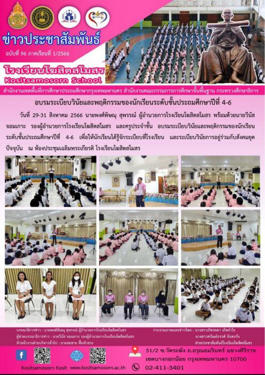 อบรมระเบียบวินัยและพฤติกรรมของนักเรียนระดับชั้นประถมศึกษาปีที่ 4-6 วันที่ 29-31 สิงหาคม 2566 นายพงศ์พิษณุ สุพรรณ์ ผู้อำนวยการโรงเรียนโฆสิตสโมสร พร้อมด้วยนายวีนัส จอมเกาะ รองผู้อำนวยการโรงเรียนโฆสิตสโมสร และครูประจำชั้น อบรมระเบียบวินัยและพฤติกรรมของนักเรียนระดับชั้นประถมศึกษาปีที่ 4-6 เพื่อให้นักเรียนได้รู้จักระเบียบที่โรงเรียน และระเบียบวินัยการอยู่ร่่วมกับสังคมยุคปัจจุบัน ณ ห้องประชุมเฉลิมพระเกียรติ โรงเรียนโฆสิตสโมสร S:0