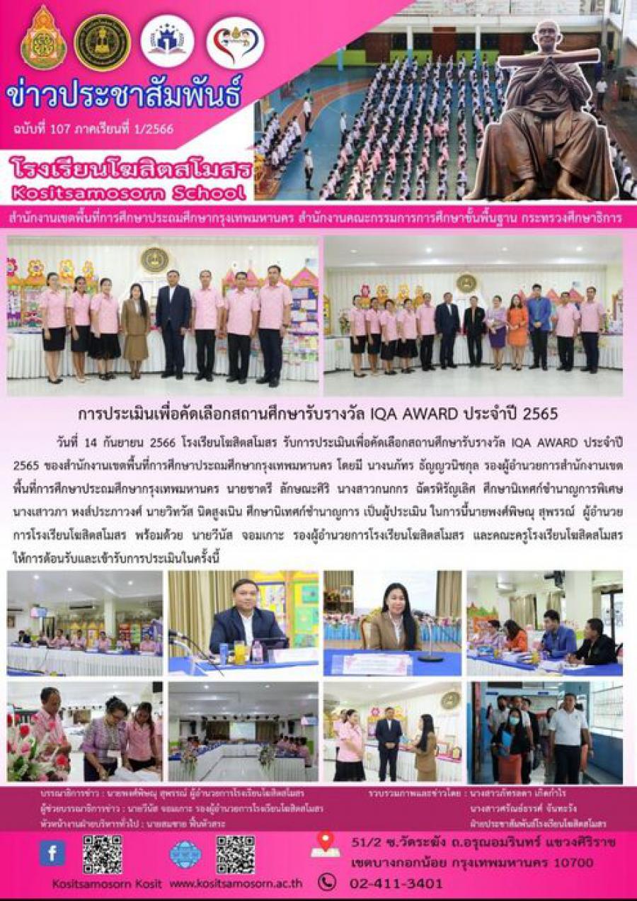 การประเมินเพื่อคัดเลือกสถานศึกษารับรางวัล IQA AWARD ประจำปี 2565 วันที่ 14 กันยายน 2566 โรงเรียนโฆสิตสโมสร รับการประเมินเพื่อคัดเลือกสถานศึกษารับรางวัล IQA AWARD ประจำปี 2565 ของสำนักงานเขตพื้นที่การศึกษาประถมศึกษากรุงเทพมหานคร โดยมี นางนภัทร ธัญญวนิชกุล รองผู้อำนวยการสำนักงานเขตพื้นที่การศึกษาประถมศึกษากรุงเทพมหานคร นายชาตรี ลักษณะศิริ นางสาวกนกกร ฉัตรหิรัญเลิศ ศึกษานิเทศก์ชำนาญการพิเศษ นางเสาวภา หงส์ประภาวงศ์ นายวิทวัส นิดสูงเนิน ศึกษานิเทศก์ชำนาญการ เป็นผู้ประเมิน ในการนี้นายพงศ์พิษณุ สุพรรณ์ ผู้อำนวยการโรงเรียนโฆสิตสโมสร พร้อมด้วย นายวีนัส จอมเกาะ รองผู้อำนวยการโรงเรียนโฆสิตสโมสร และคณะครูโรงเรียนโฆสิตสโมสร ให้การต้อนรับและเข้ารับการประเมินในครั้งนี้ S:0