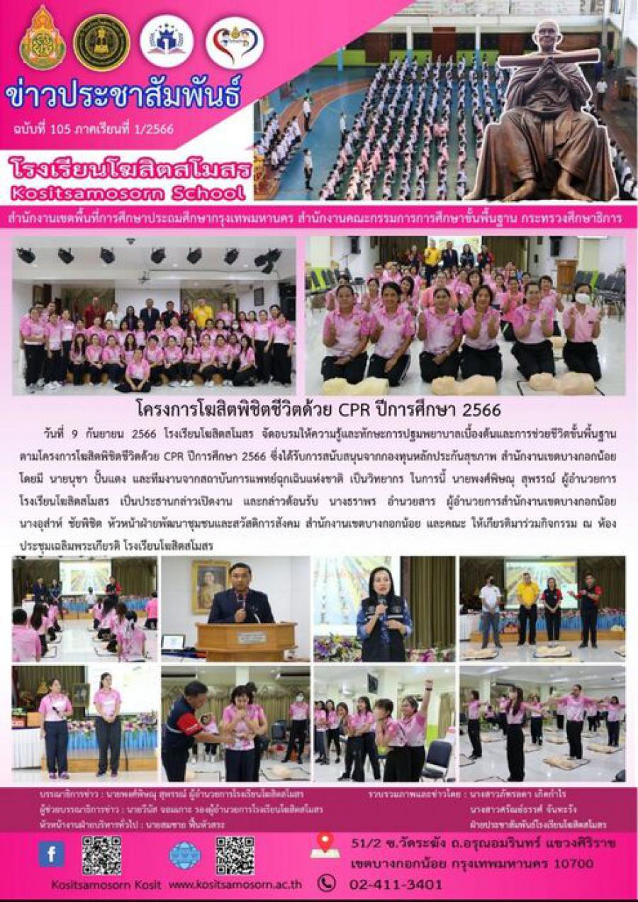 โครงการโฆสิตพิชิตชีวิตด้วย CPR ปีการศึกษา 2566 วันที่ 9 กันยายน 2566 โรงเรียนโฆสิตสโมสร จัดอบรมให้ความรู้และทักษะการปฐมพยาบาลเบื้องต้นและการช่วยชีวิตขั้นพื้นฐาน ตามโครงการโฆสิตพิชิตชีวิตด้วย CPR ปีการศึกษา 2566 ซึ่งได้รับการสนับสนุนจากกองทุนหลักประกันสุขภาพ สำนักงานเขตบางกอกน้อย โดยมี นายนุชา ปั้นแตง และทีมงานจากสถาบันการแพทย์ฉุกเฉินแห่งชาติ เป็นวิทยากร ในการนี้ นายพงศ์พิษณุ สุพรรณ์์ ผู้อำนวยการ โรงเรียนโฆสิตสโมสร เป็นประธานกล่าวเปิดงาน และกล่าวต้อนรับ นางธราพร อำนวยสาร ผู้อำนวยการสำนักงานเขตบางกอกน้อย นางอุส่าห์ ชัยพิชิต หัวหน้าฝ่ายพัฒนาชุมชนและสวัสดิการสังคม สำนักงานเขตบางกอกน้อย และคณะ ให้เกียรติมาร่วมกิจกรรม ณ ห้องประชุมเฉลิมพระเกียรติ โรงเรียนโฆสิตสโมสร S:0