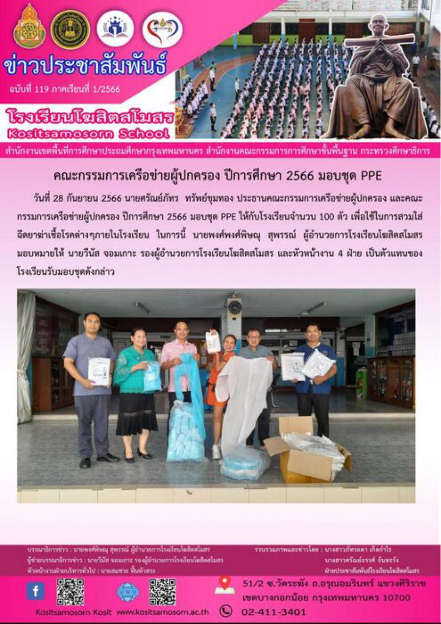 คณะกรรมการเครือข่ายผู้ปกครอง ปีการศึกษา 2566 มอบชุด PPE วันที่ 28 กันยายน 2566 นายศรัณย์ภัทร ทรัพย์ขุมทอง ประธานคณะกรรมการเครือข่ายผู้ปกครอง และคณะกรรมการเครือข่ายผู้ปกครอง ปีการศึกษา 2566 มอบชุด PPE ให้กับโรงเรียนจำนวน 100 ตัว เพื่อใช้ในการสวมใส่ฉีดยาฆ่าเชื้อโรคต่างๆภายในโรงเรียน ในการนี้ นายพงศ์พงศ์พิษณุ สุพรรณ์ ผู้อำนวยการโรงเรียนโฆสิตสโมสร มอบหมายให้ นายวีนัส จอมเกาะ รองผู้อำนวยการโรงเรียนโฆสิตสโมสร และหัวหน้างาน 4 ฝ่าย เป็นตัวแทนของโรงเรียนรับมอบชุดดังกล่าว S:0