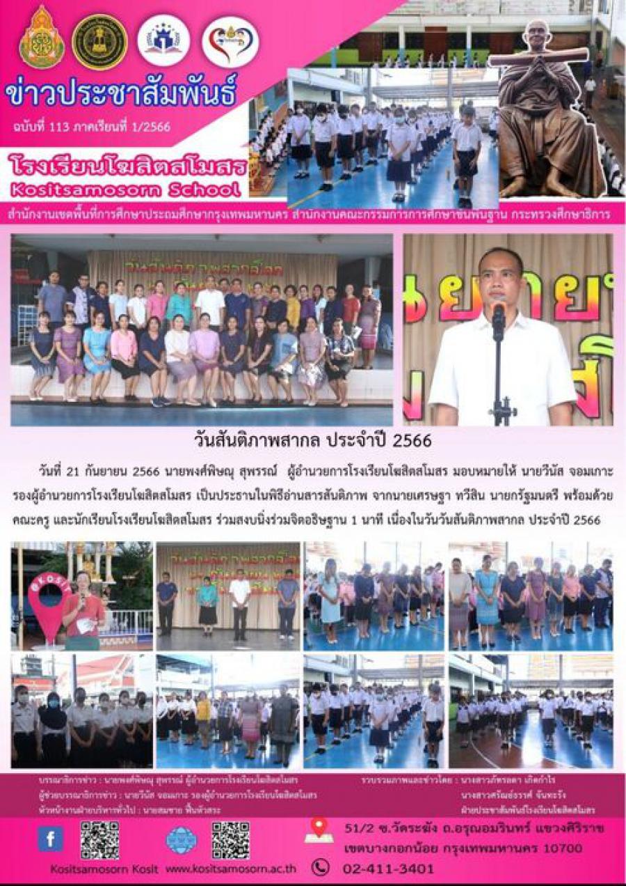 วันสันติภาพสากล ประจำปี 2566 วันที่ 21 กันยายน 2566 นายพงศ์พิษณุ สุพรรณ์์ ผู้อำนวยการโรงเรียนโฆสิตสโมสร มอบหมายให้ นายวีนัส จอมเกาะ รองผู้อำนวยการโรงเรียนโฆสิตสโมสร เป็นประธานในพิธีอ่านสารสันติภาพ จากนายเศรษฐา ทวีสิน นายกรัฐมนตรี พร้อมด้วยคณะครู และนักเรียนโรงเรียนโฆสิตสโมสร ร่วมสงบนิ่งร่วมจิตอธิษฐาน 1 นาที เนื่องในวันวันสันติภาพสากล ประจำปี 2566 S:0