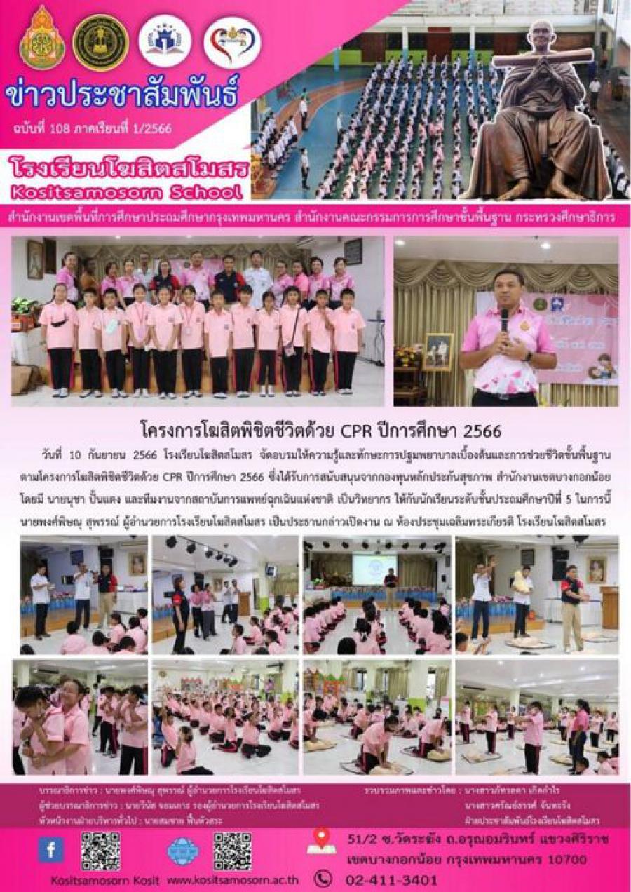 โครงการโฆสิตพิชิตชีวิตด้วย CPR ปีการศึกษา 2566 วันที่ 10 กันยายน 2566 โรงเรียนโฆสิตสโมสร จัดอบรมให้ความรู้และทักษะการปฐมพยาบาลเบื้องต้นและการช่วยชีวิตขั้นพื้นฐานตามโครงการโฆสิตพิชิตชีวิตด้วย CPR ปีการศึกษา 2566 ซึ่งได้รับการสนับสนุนจากกองทุนหลักประกันสุขภาพ สำนักงานเขตบางกอกน้อย โดยมี นายนุชา ปั้นแตง และทีมงานจากสถาบันการแพทย์ฉุกเฉินแห่งชาติ เป็นวิทยากร ให้กับนักเรียนระดับชั้นประถมศึกษาปีที่ 5 ในการนี้ นายพงศ์พิษณุ สุพรรณ์์ ผู้อำนวยการโรงเรียนโฆสิตสโมสร เป็นประธานกล่าวเปิดงาน ณ ห้องประชุมเฉลิมพระเกียรติ โรงเรียนโฆสิตสโมสร S:0