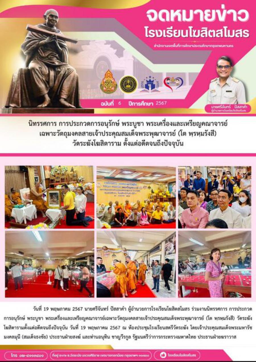 วันที่ 19 พฤษภาคม 2567 นายศรีจันทร์ ปัสสาคำ ผู้อำนวยการโรงเรียนโฆสิตสโมสร ร่วมงานนิทรรศการ การประกวดการอนุรักษ์ พระบูชา พระเครื่องและเหรียญคณาจารย์เฉพาะวัตถุมงคลสายเจ้าประคุณสมเด็จพระพุฒาจารย์ (โต พฺรหฺมรังสี) วัดระฆังโฆสิตารามตั้งแต่อดีตจนถึงปัจจุบัน วันที่ 19 พฤษภาคม 2567 ณ ห้องประชุมโรงเรียนสตรีวัดระฆัง โดยเจ้าประคุณสมเด็จพระมหารัชมงคลมุนี (สมเด็จธงชัย) ประธานฝ่ายสงฆ์ และท่านอนุทิน ชาญวีรกูล รัฐมนตรีว่าการกระทรวงมหาดไทย ประธานฝ่ายฆราวาส S:0