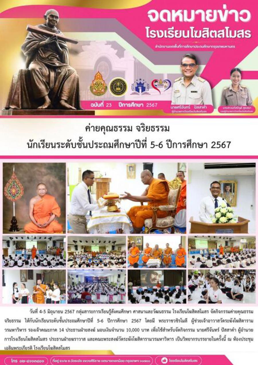 ค่ายคุณธรรม จริยธรรม นักเรียนระดับชั้นประถมศึกษาปีที่ 5-6 ปีการศึกษา 2567 วันที่ 4-5 มิถุนายน 2567 กลุ่มสาระการเรียนรู้สังคมศึกษา ศาสนาและวัฒนธรรม โรงเรียนโฆสิตสโมสร จัดกิจกรรมค่ายคุณธรรม จริยธรรม ให้กับนักเรียนระดับชั้นประถมศึกษาปีที่ 5-6 ปีการศึกษา 2567 โดยมี พระราชวชิรโมลี ผู้ช่วยเจ้าอาวาสวัดระฆังโฆสิตารามวรมหาวิหาร รองเจ้าคณะภาค 14 ประธานฝ่ายสงฆ์ มอบเงินจำนวน 10,000 บาท เพื่อใช้สำหรับจัดกิจกรรม นายศรีจันทร์ ปัสสาคำ ผู้อำนวยการโรงเรียนโฆสิตสโมสร ประธานฝ่ายฆราวาส และคณะพระสงฆ์วัดระฆังโฆสิตารามวรมหาวิหาร เป็นวิทยากรบรรยายในครั้งนี้ ณ ห้องประชุมเฉลิมพระเกียรติ โรงเรียนโฆสิตสโมสร S:0